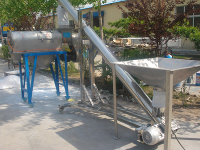 本設備篩網為圓筒狀,置于機體內,物料通過螺旋輸送系統后,和氣流混合、霧化進入網筒內;通過網筒內風輪葉片使物料同時受離心力和旋風推進力,從而迫使物料噴射過網,由細料排出口排出,不能過網的物料沿筒壁從粗料排出口排出。